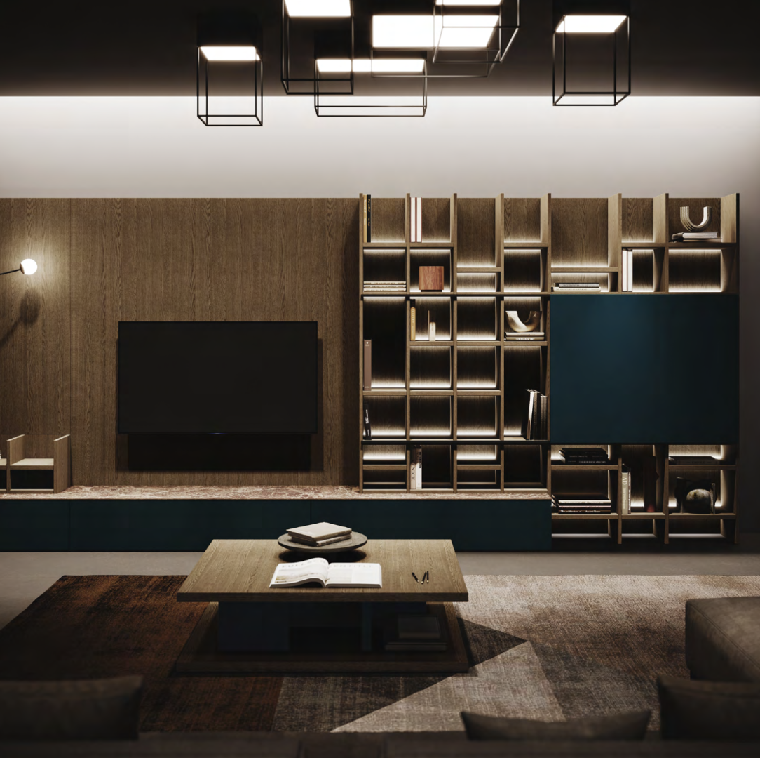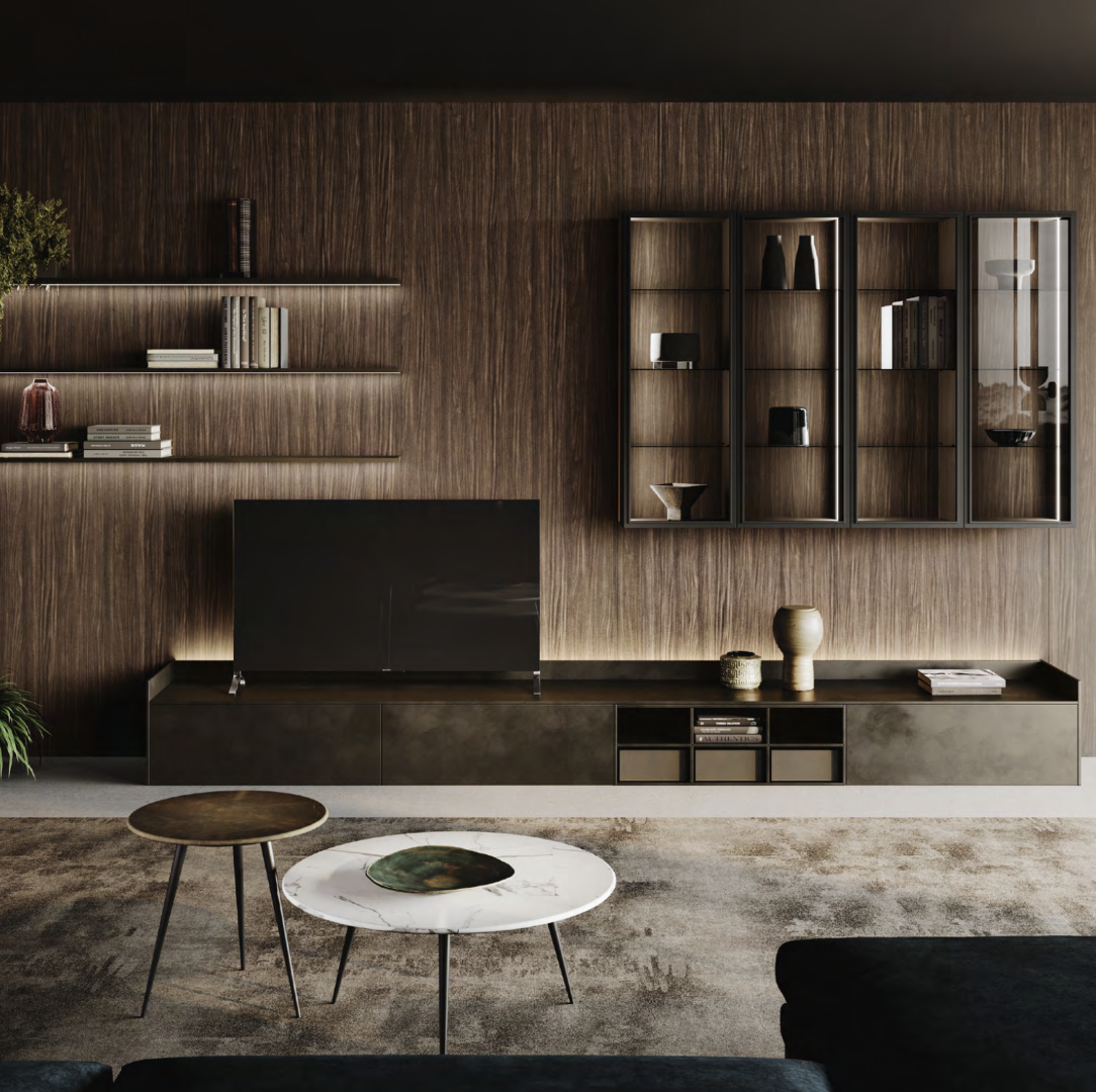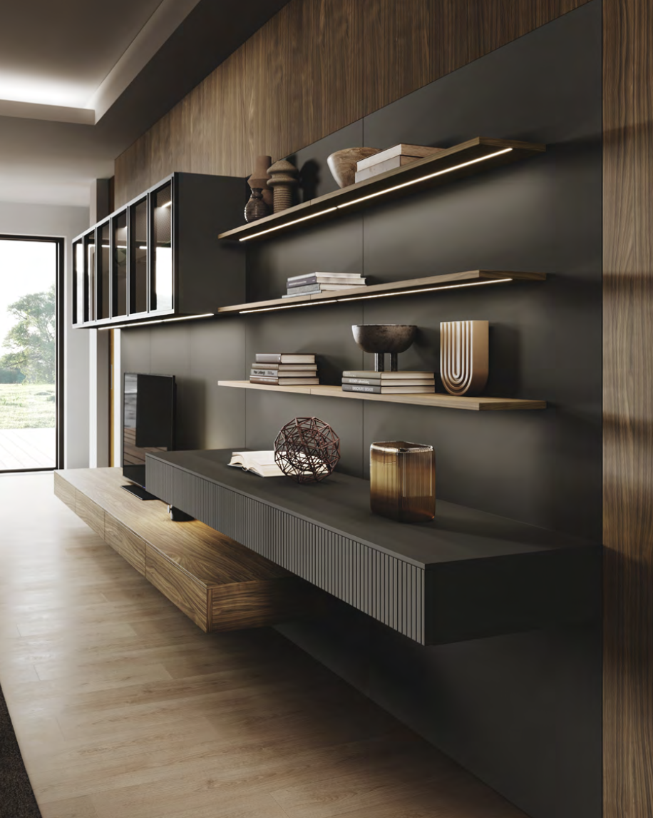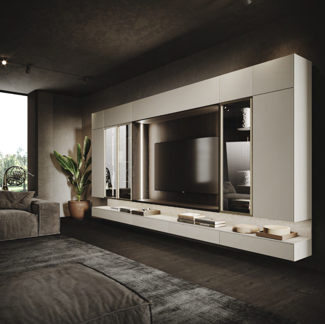 Suspended base cabinets support your TV while closed wall units and open displays form attractive equipped walls: Stosa furnishing elements are multi-functional by design and adapt to all kinds of domestic space.
