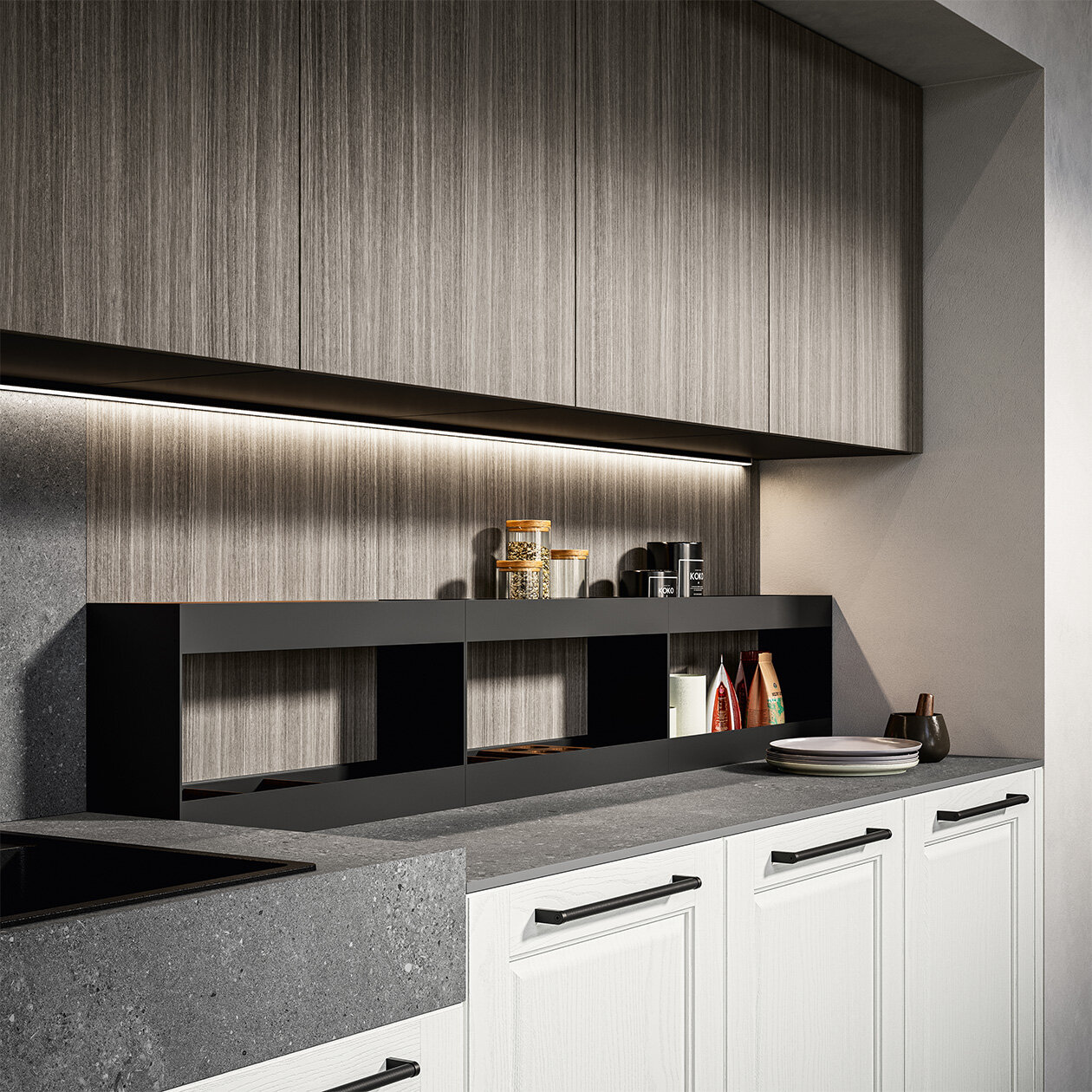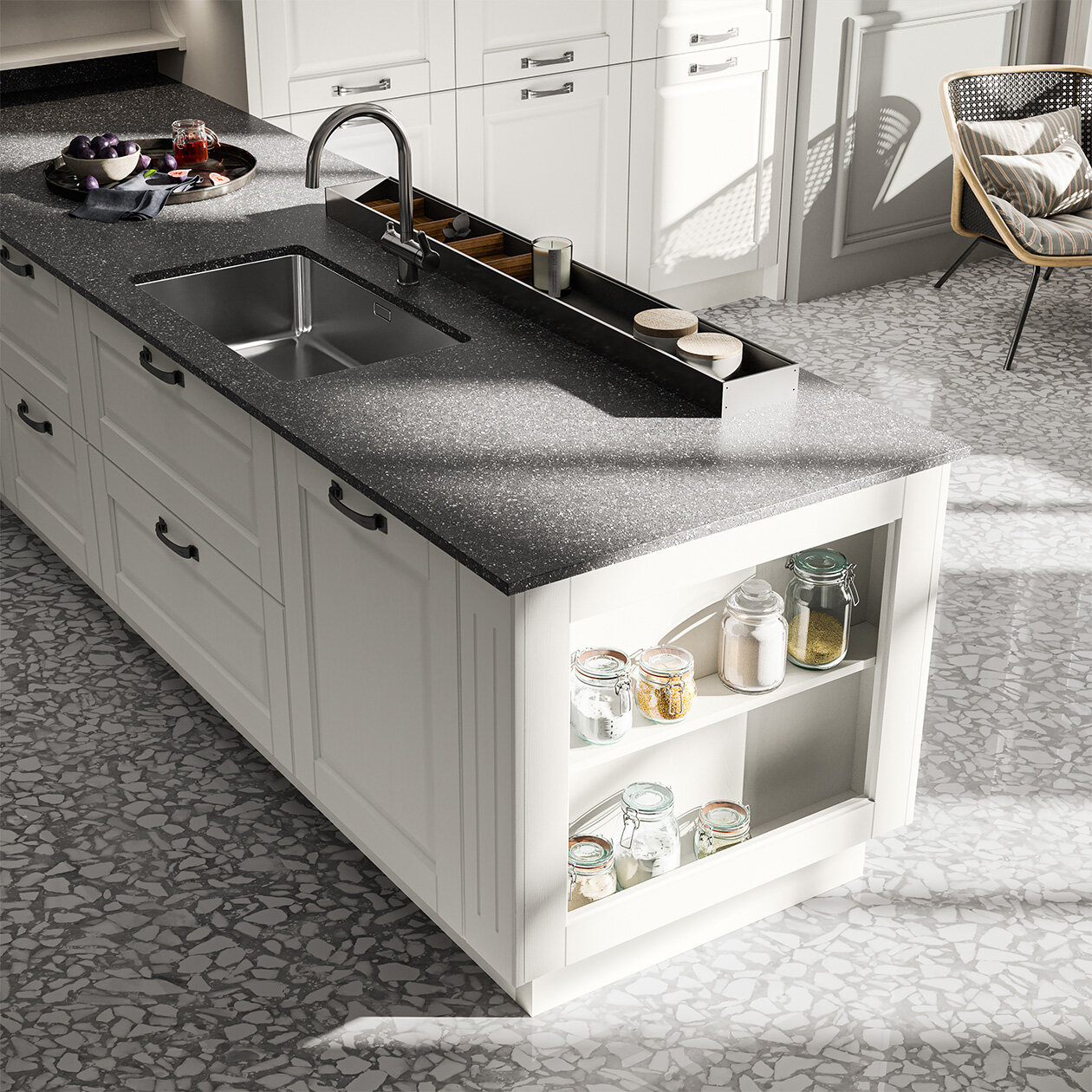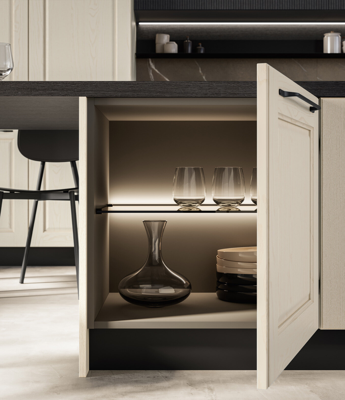Arredo3’s Asolo model ushers in a refined reassuring atmosphere with its unassailable stylishness and its raised panel door with a frame in solid ash.