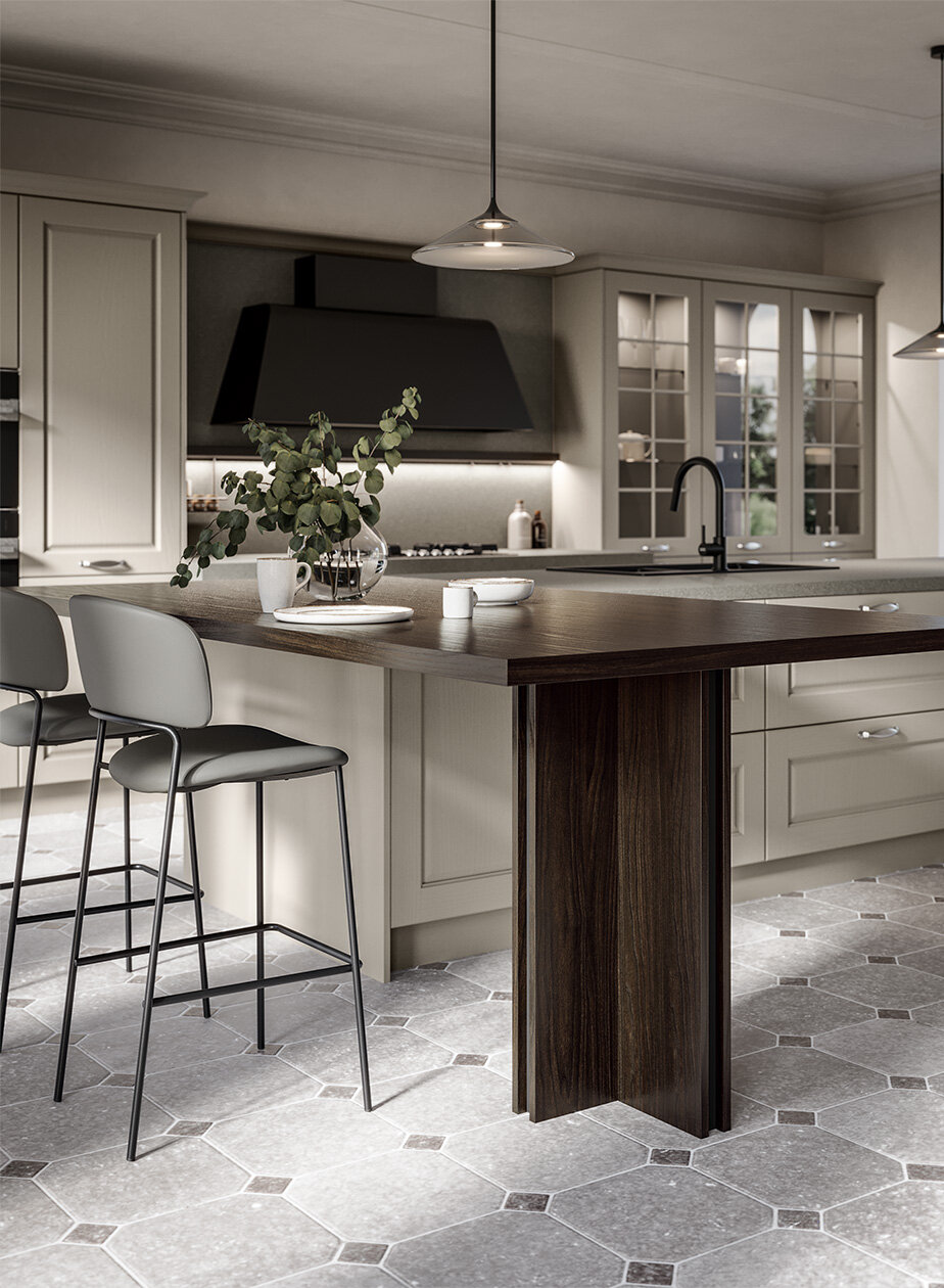 Pickled or lacquered wood for a classic kitchen with framed cabinetry