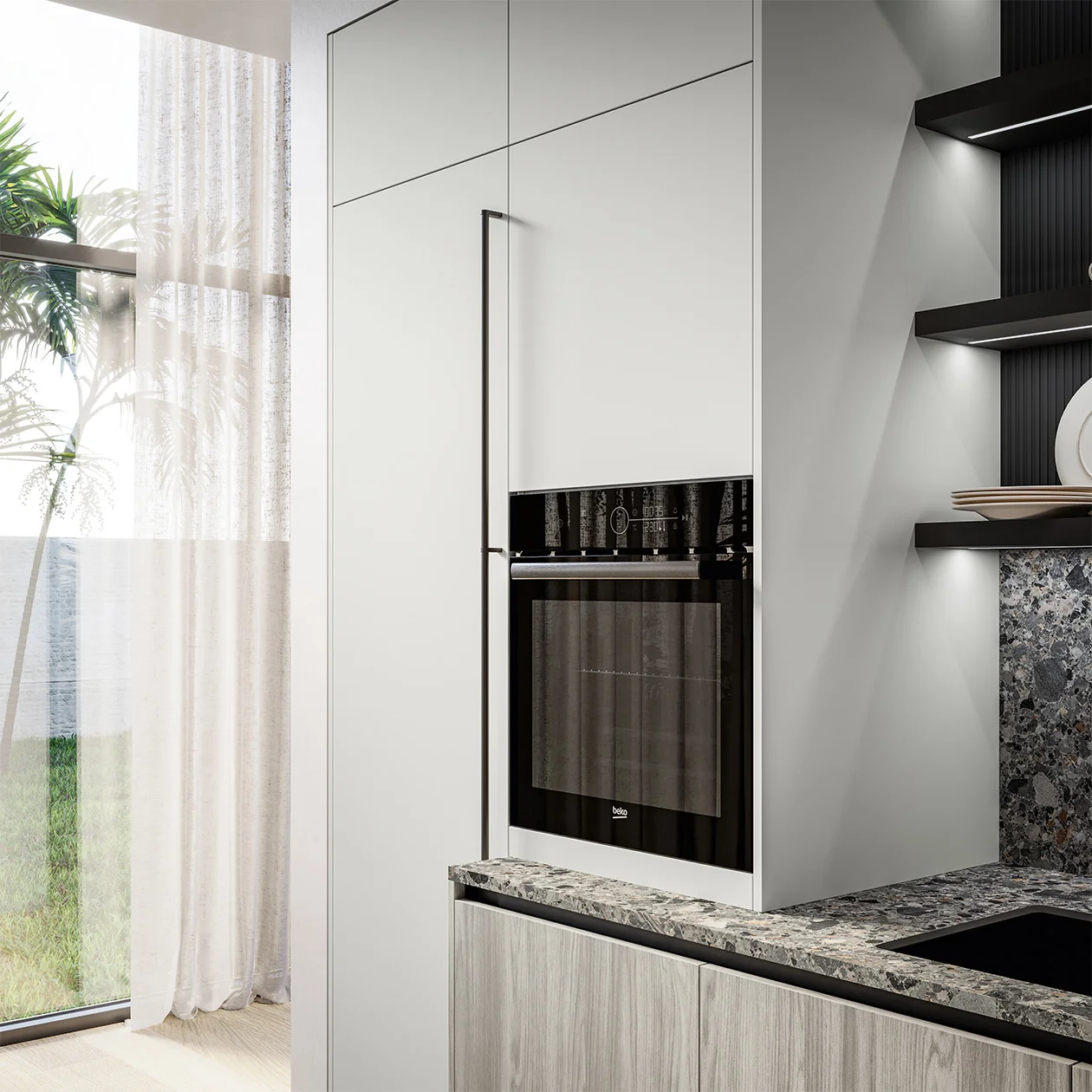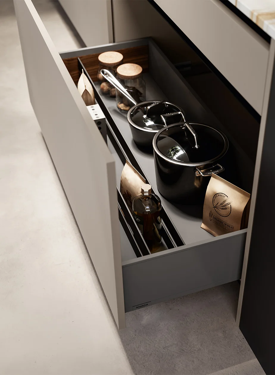 Three material choices for Cloe. The first one is UV lacquers treated with ultraviolet (UV) lamps to create a hardwearing product and guarantee longevity. They are available in an elegant matt or shiny version that will brighten any setting. The second option and next level up consists of UV excimer lacquers. Innovative technology ensures extremely matt surfaces with a greater ability to withstand scratching, abrasions and chemicals. With a touchable texture, they are fingerprint resistant and easy to clean, containing silver ions with antiseptic properties that prevent bacterial growth. Last but not least, there are also top-end laminates for Cloe in subtle shades, with urban-style resin effects or in a wood effect that is always appealing in a kitchen.