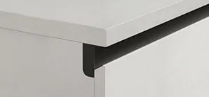 22.5 mm thick MDF door. Faced in 140 g/sq.m melamine on both sides. Bottom edge in 140 g/sq.m polyester. Outside and edges in 140 g/sq.m gloss acrylic lacquer or 140 g/sq.m matte polyurethane lacquer. Inside in 140 g/sq.m matte polyurethane lacquer. Outside face brushed with paste and polish and coated with protective vinyl film. Extruded handle grip.