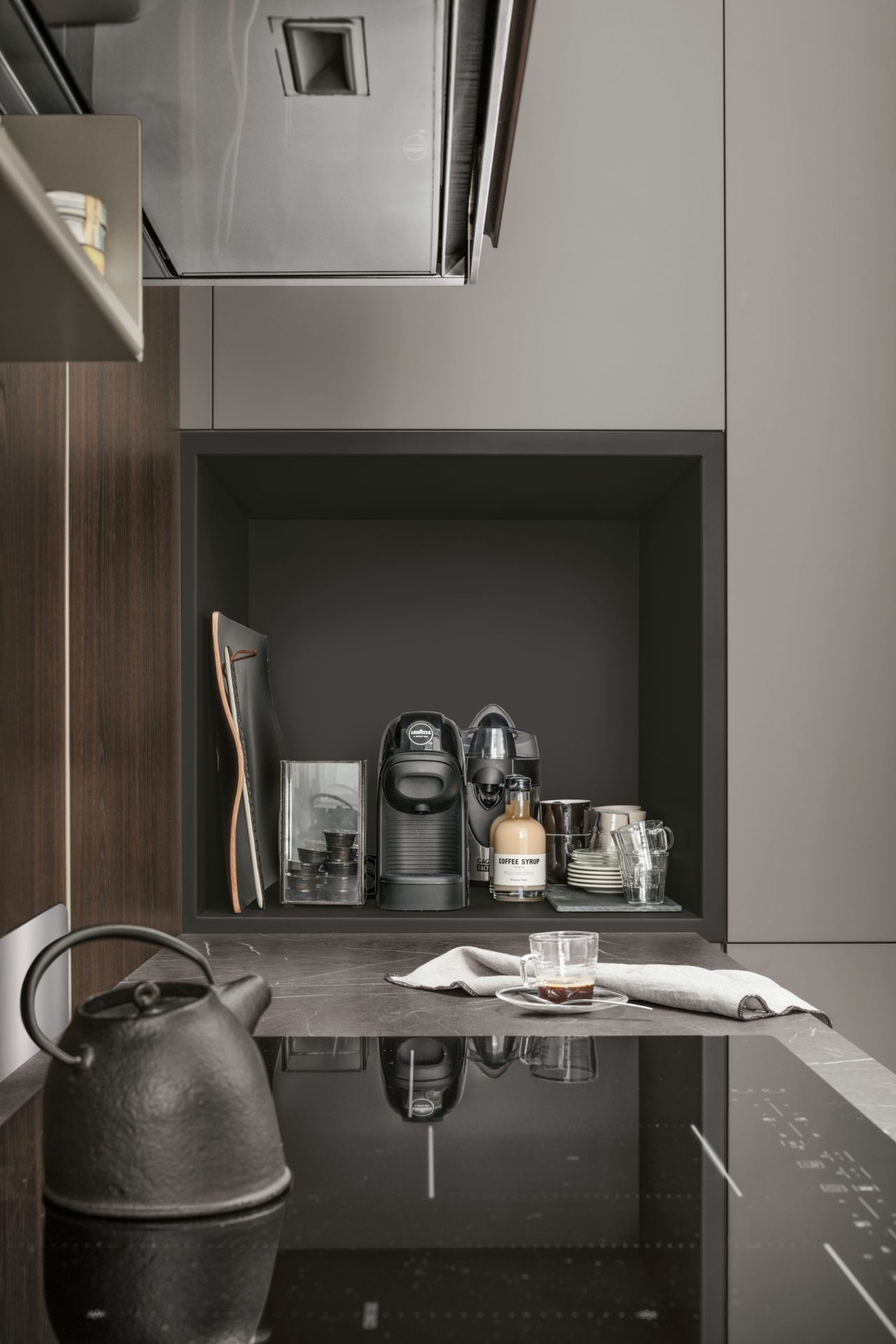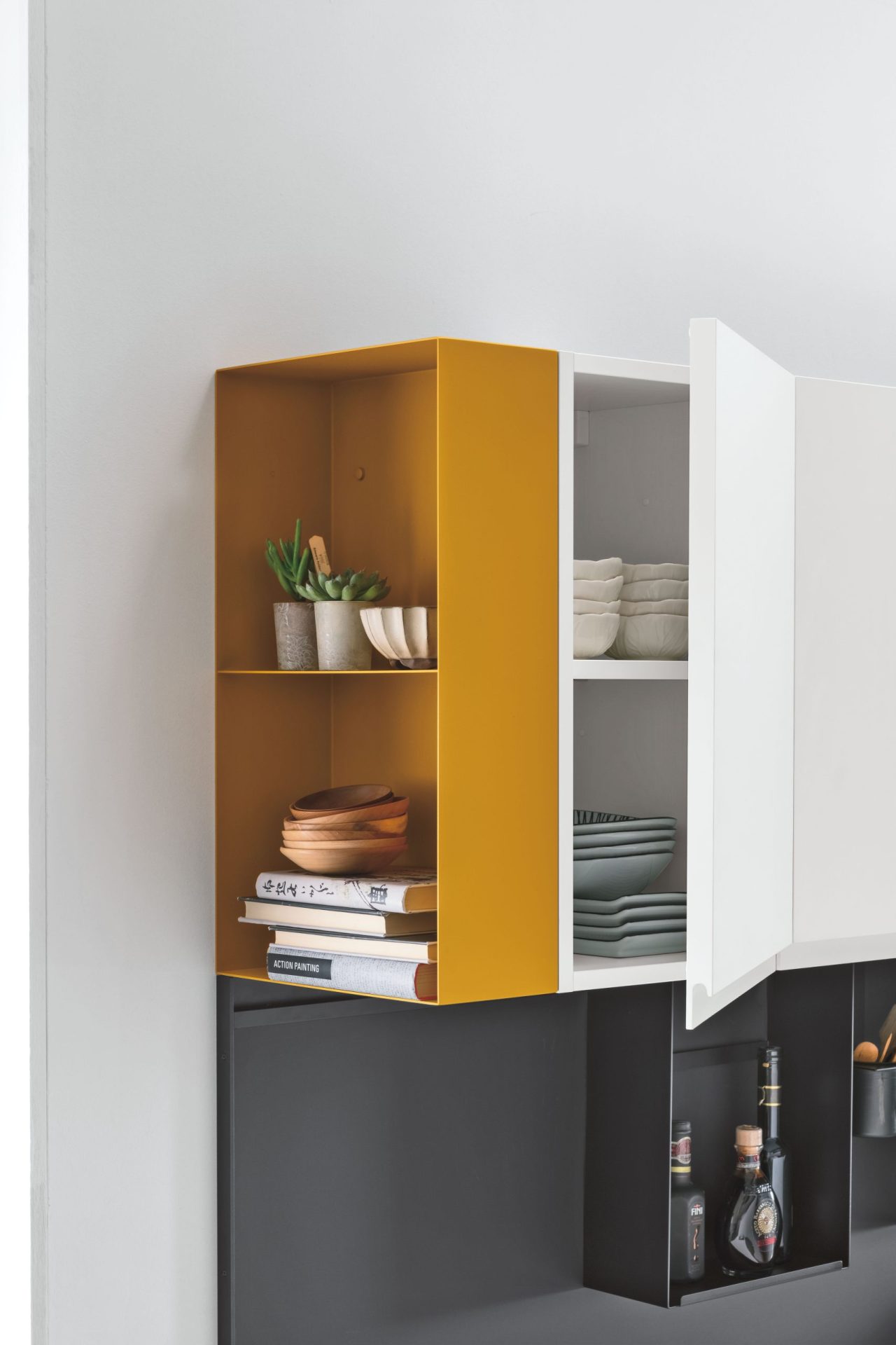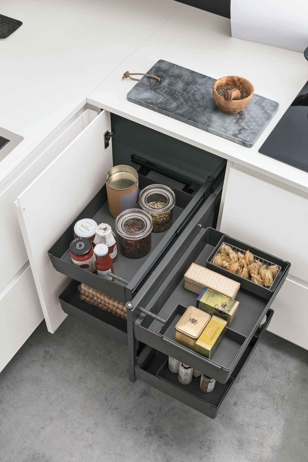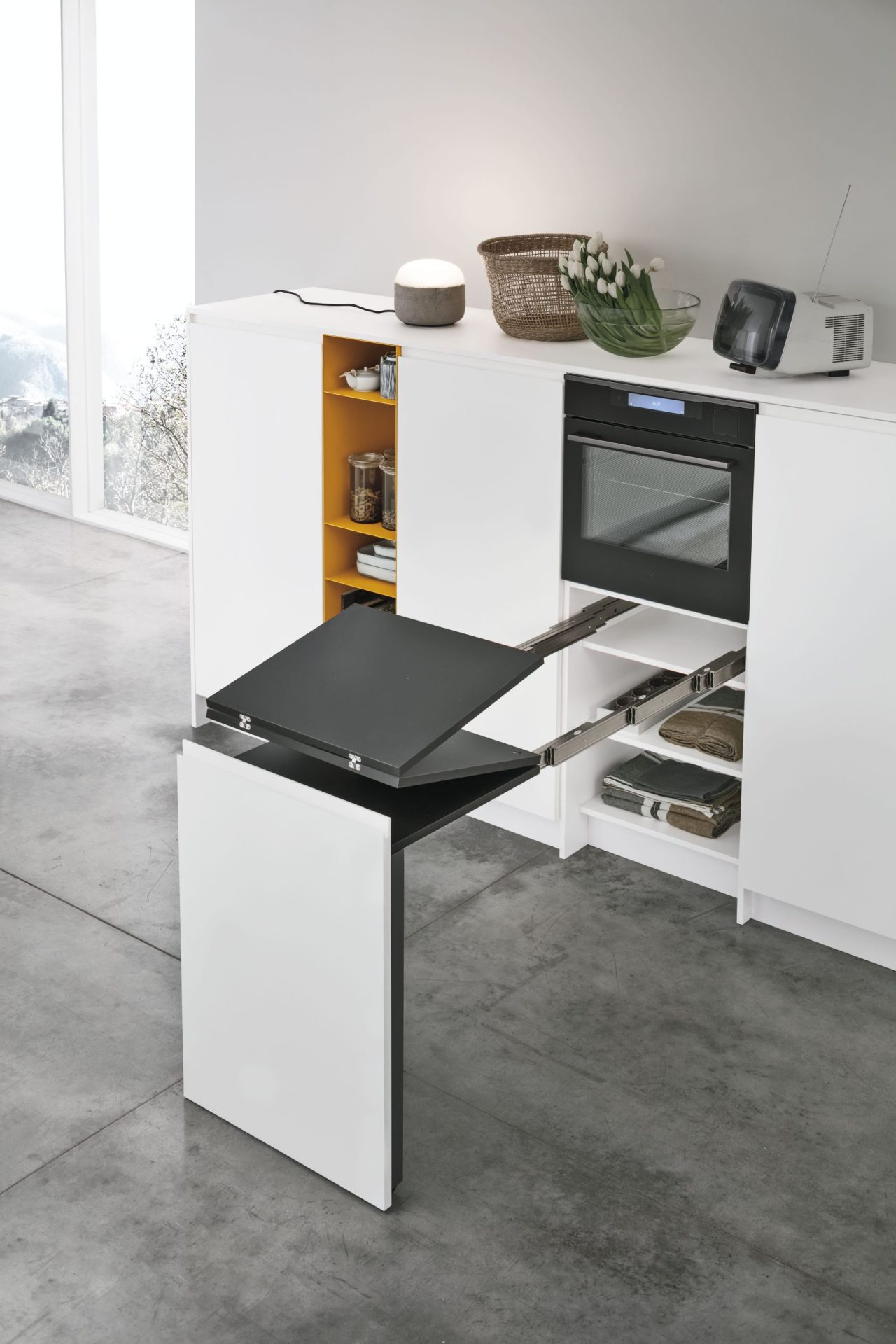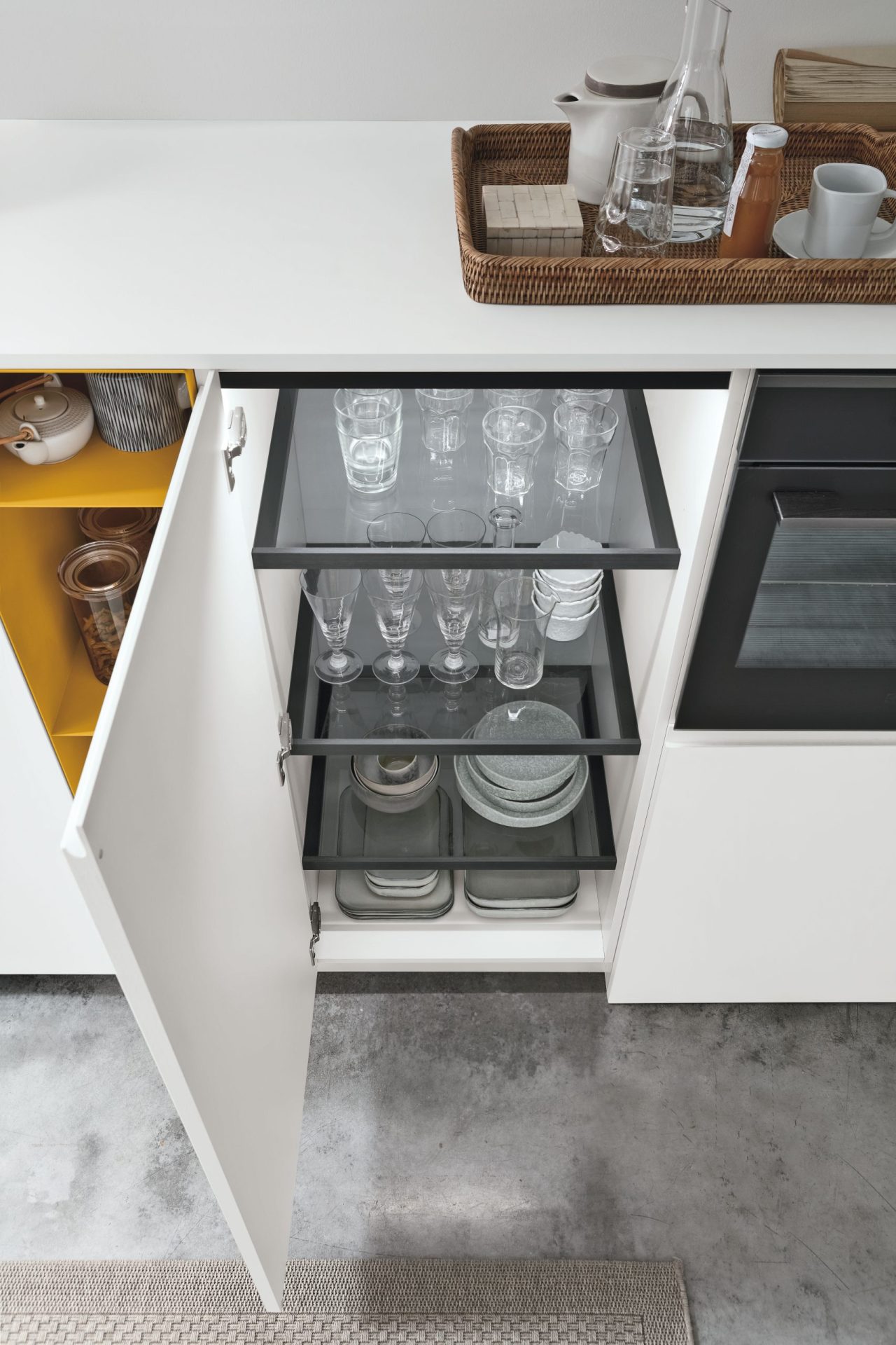 The elements that characterise Karma give a dynamic feel to kitchen compositions, and guarantee a visually balanced and cohesive style that embodies intelligent living solutions. Available with drawers of different sizes (12, 24 and 36 cm), Karma allows the designer to experiment with alternating volumes and clean lines to create a more compact kitchen.