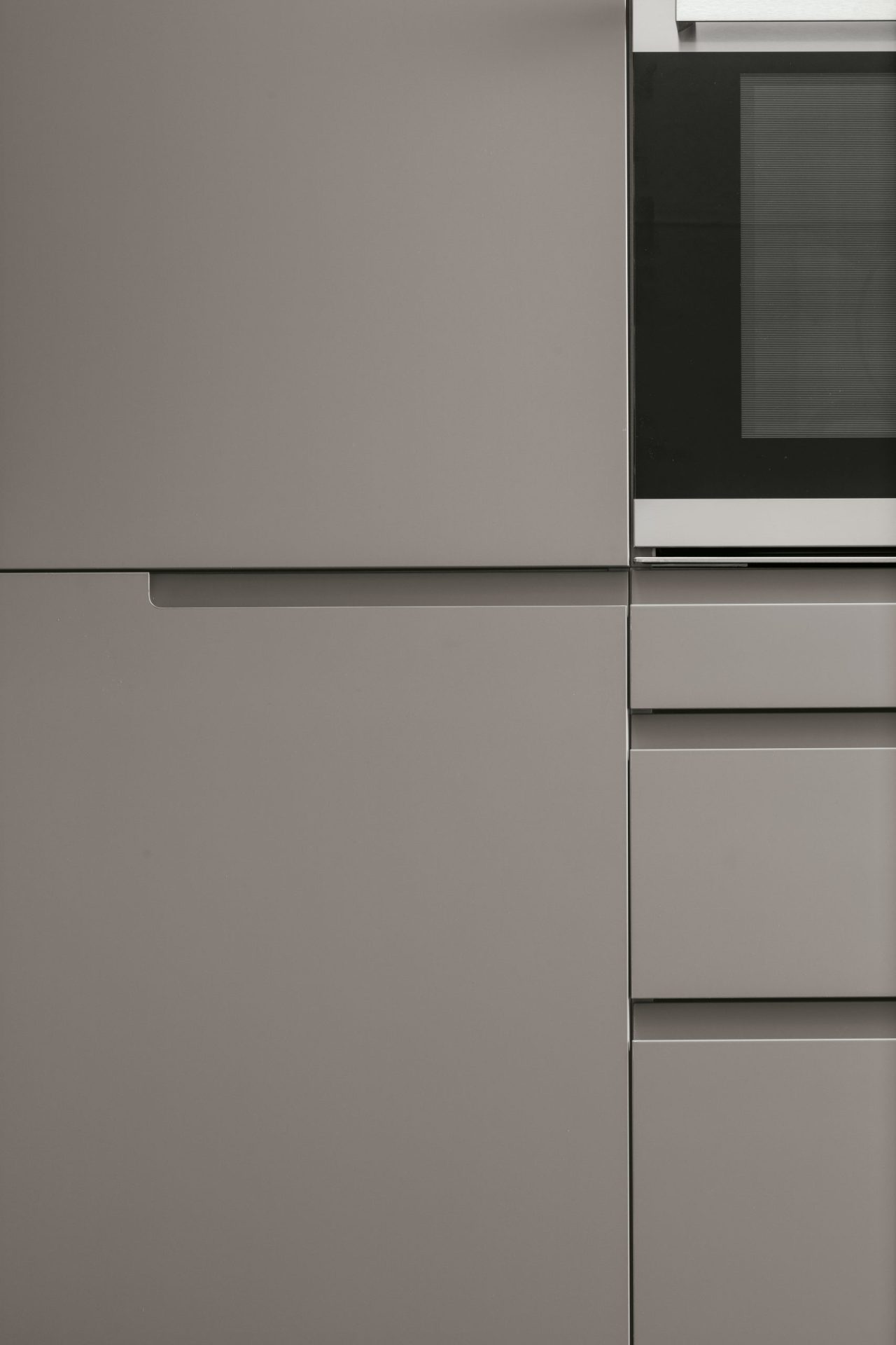 22 mm thick MDF door faced in melamine on inside. Handle grip in extruded material 0.3 mm thick PET facing on outside. Polymer edge band on sides in same colour as PET.