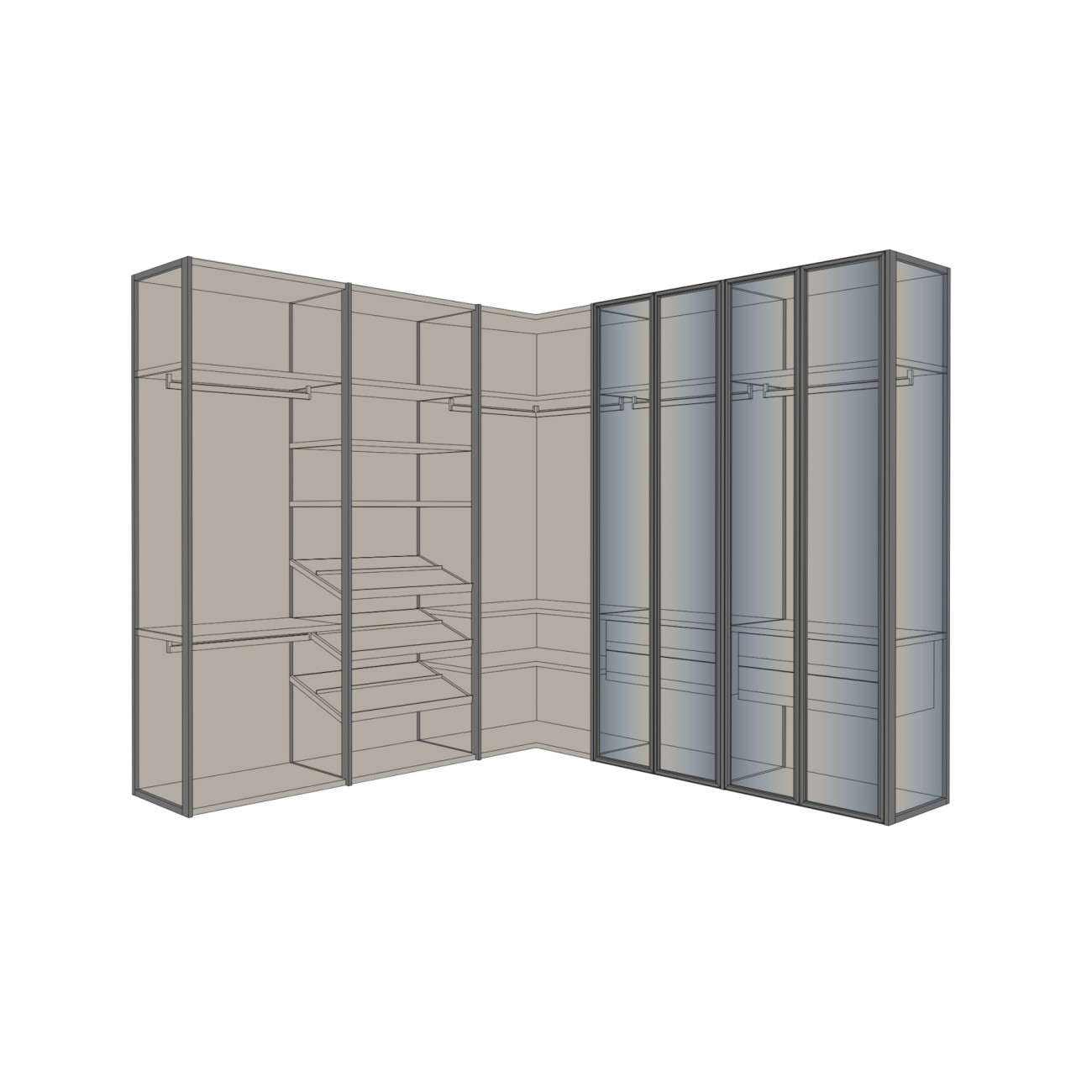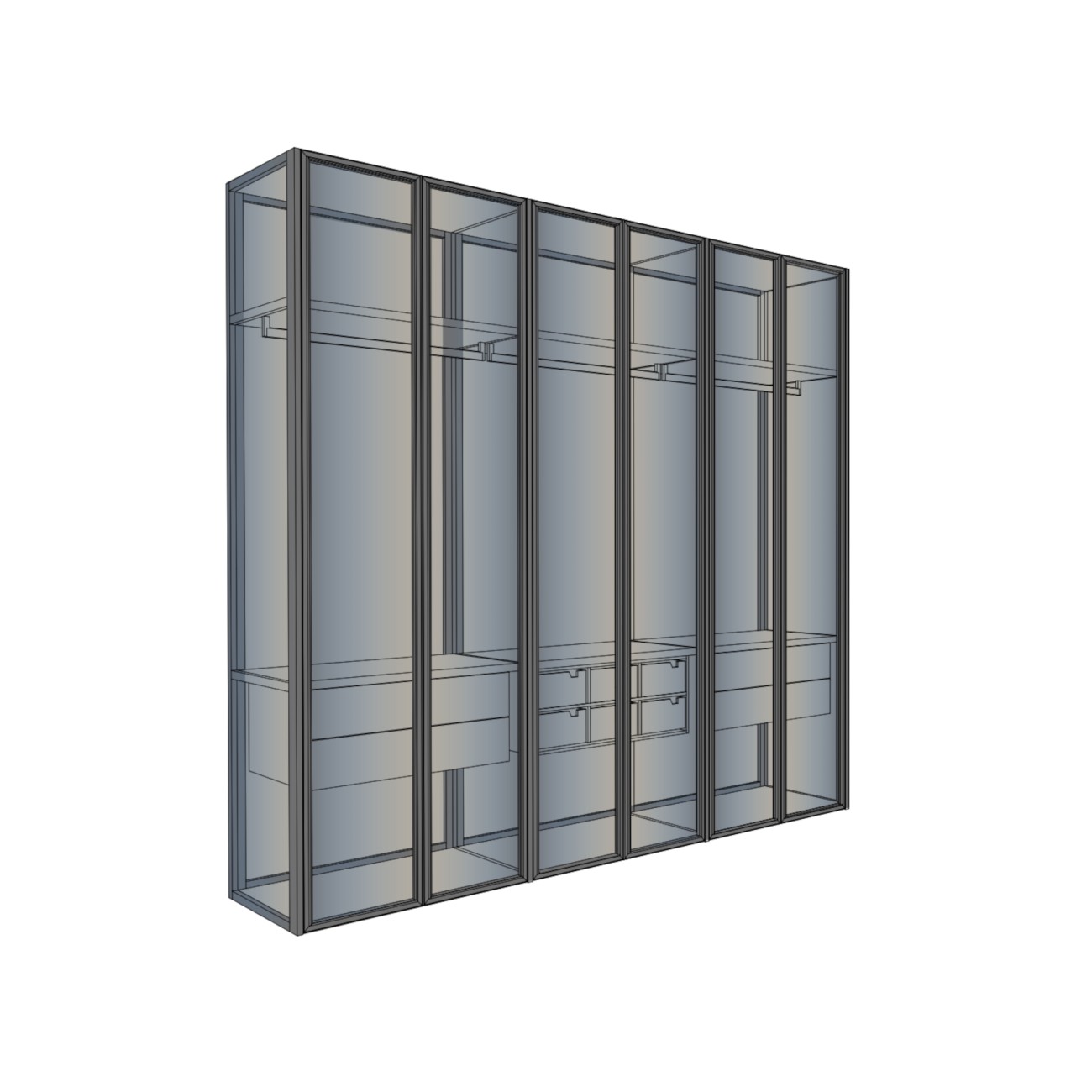 Naked is a walk-in closet system that highlights the interior spaces thanks to the self-supporting structure that eliminates the need for side and rear panels, leaving full freedom of expression to aluminum and glass, thanks to the union with the aesthetics of Evans Air doors.
