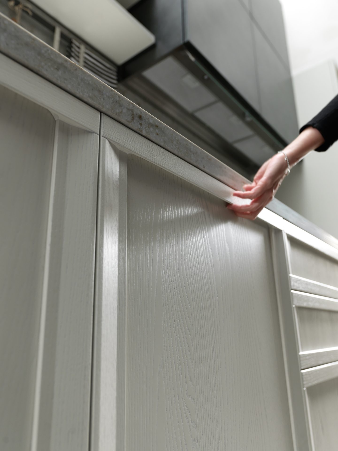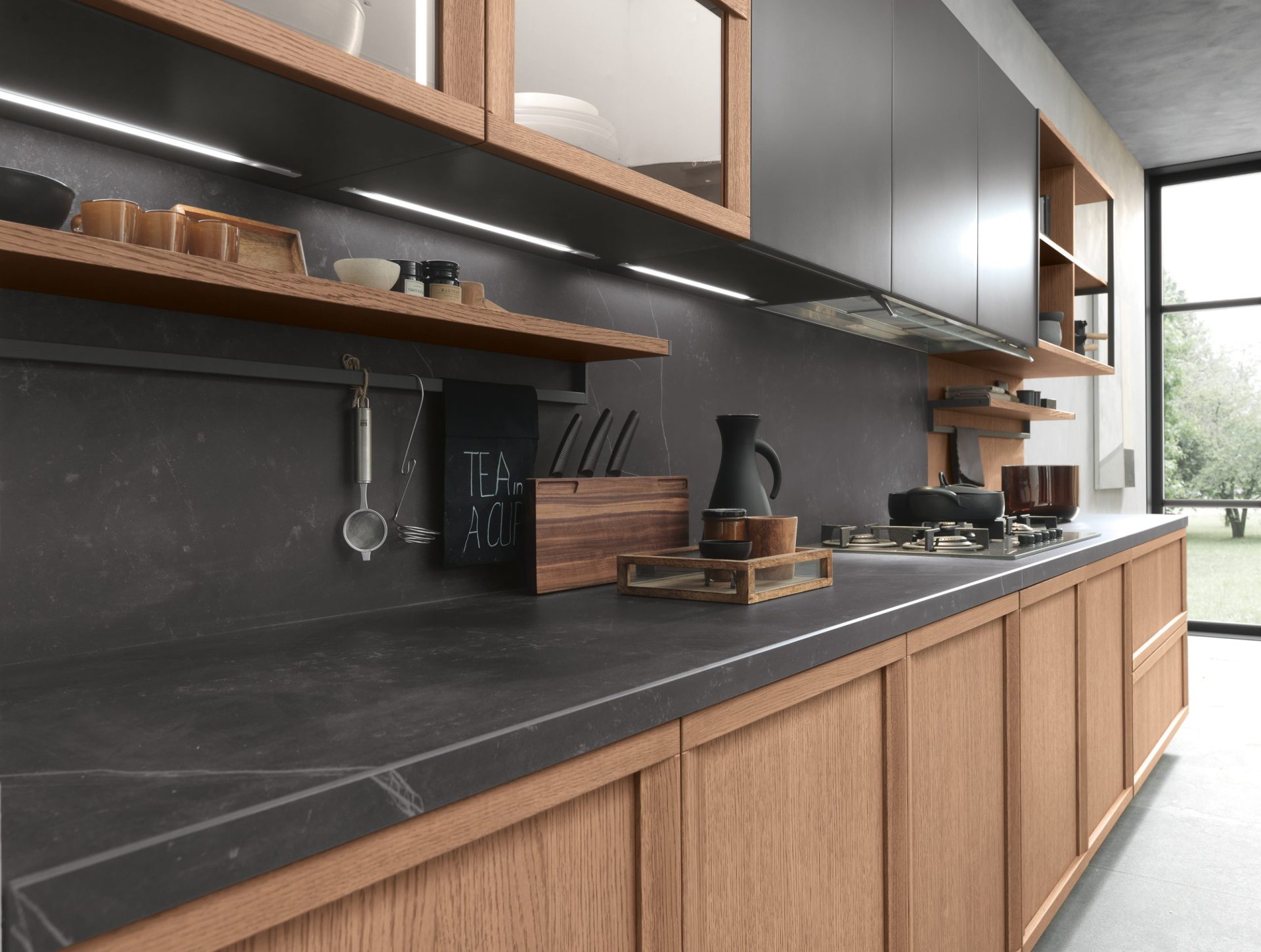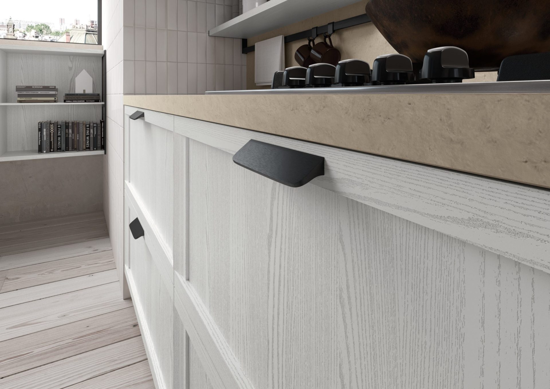 Typically classical details, like shaker doors and large areas of glass, merge perfectly into a kitchen composition characterised by versatile lines that are ideal for both metropolitan and traditional contexts. The doors’ lightweight outer frame features inward-sloping elements that contrast with slender horizontal rails containing a practical handle.