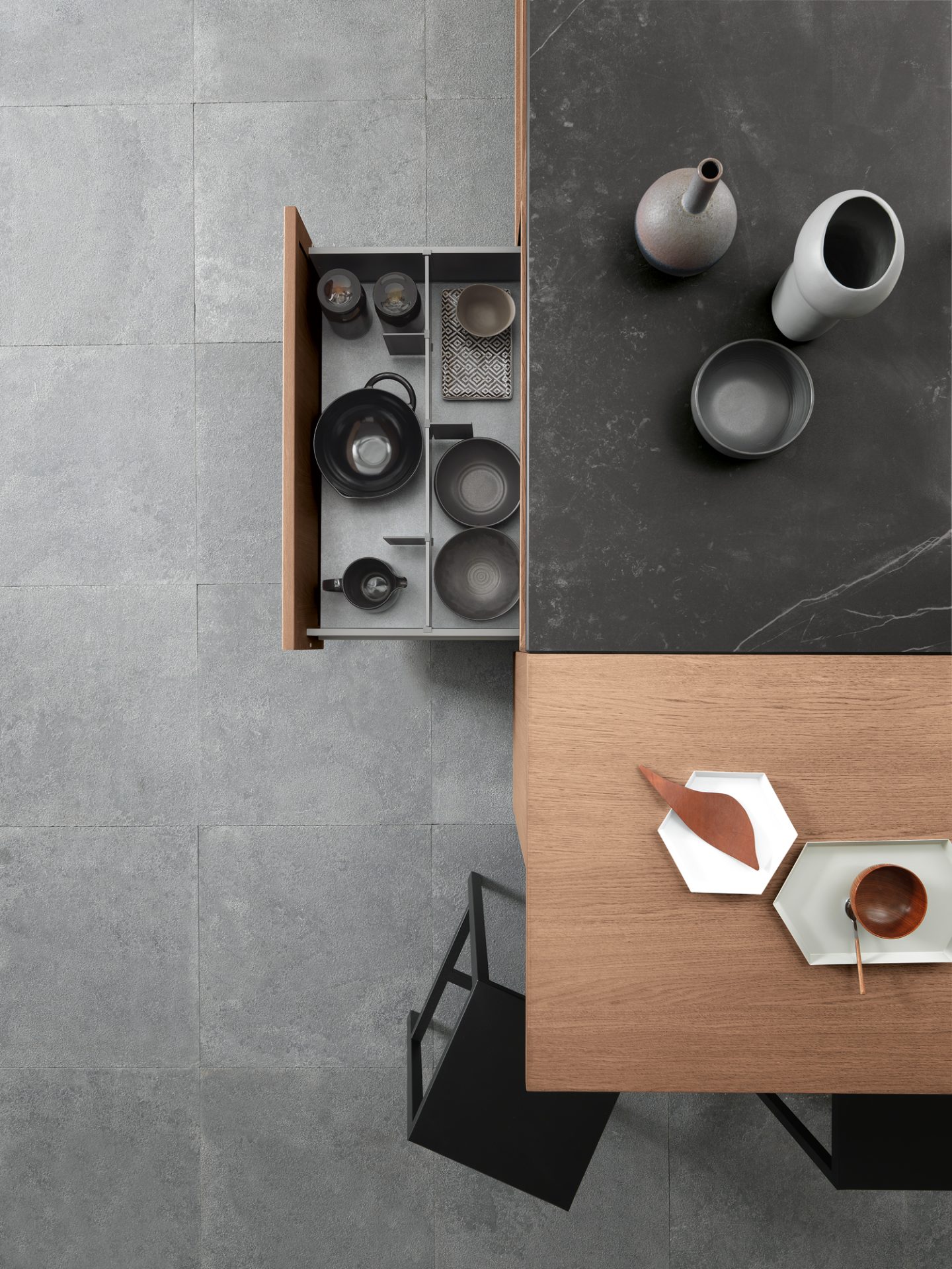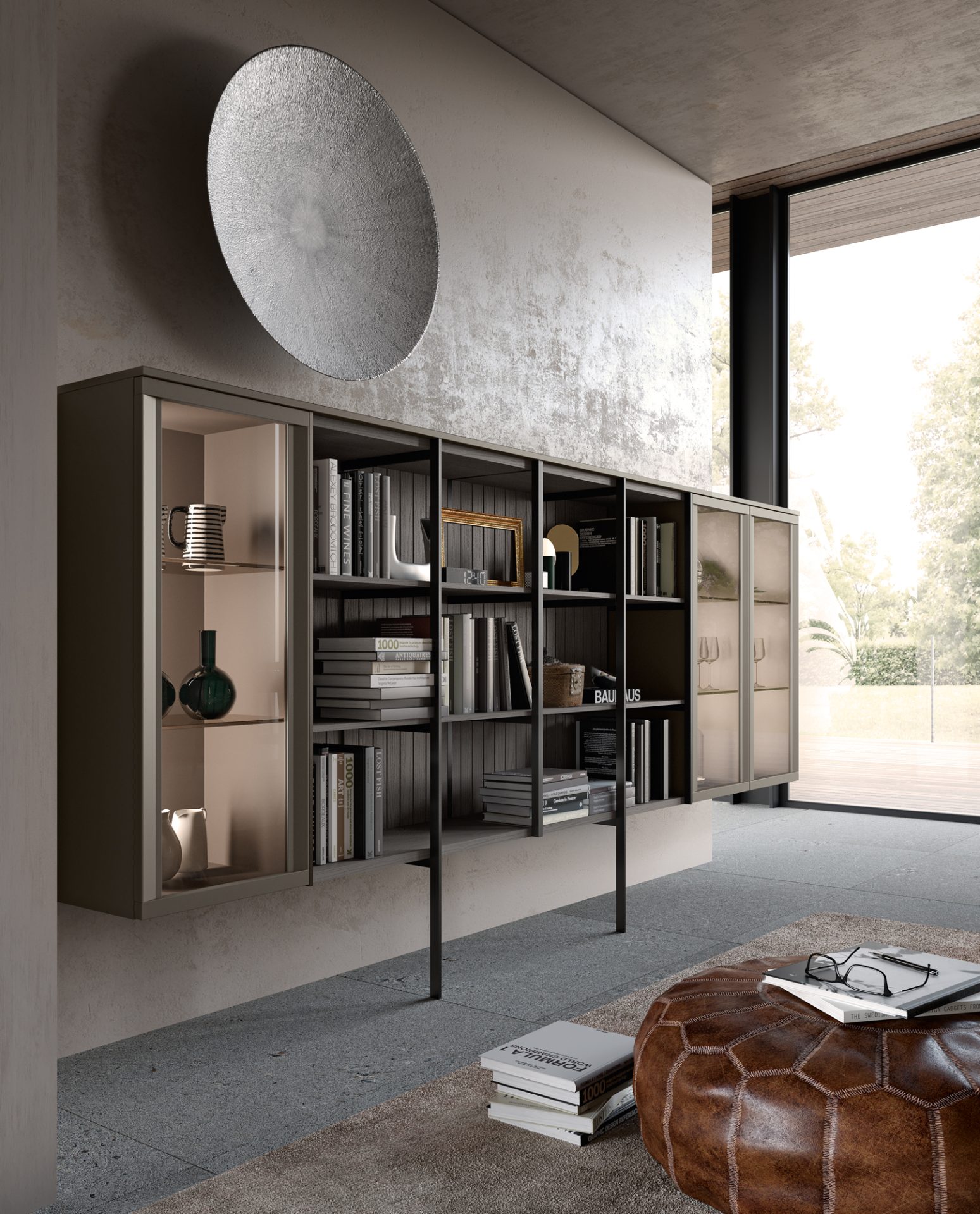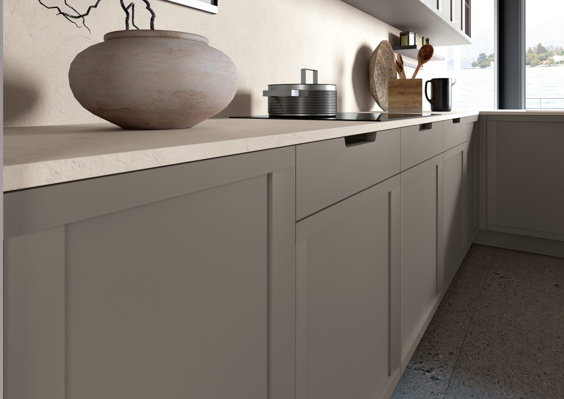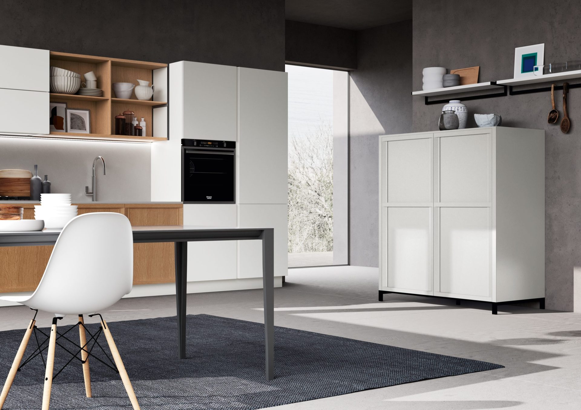 Typically classical details, like shaker doors and large areas of glass, merge perfectly into a kitchen composition characterised by versatile lines that are ideal for both metropolitan and traditional contexts. The doors’ lightweight outer frame features inward-sloping elements that contrast with slender horizontal rails containing a practical handle.