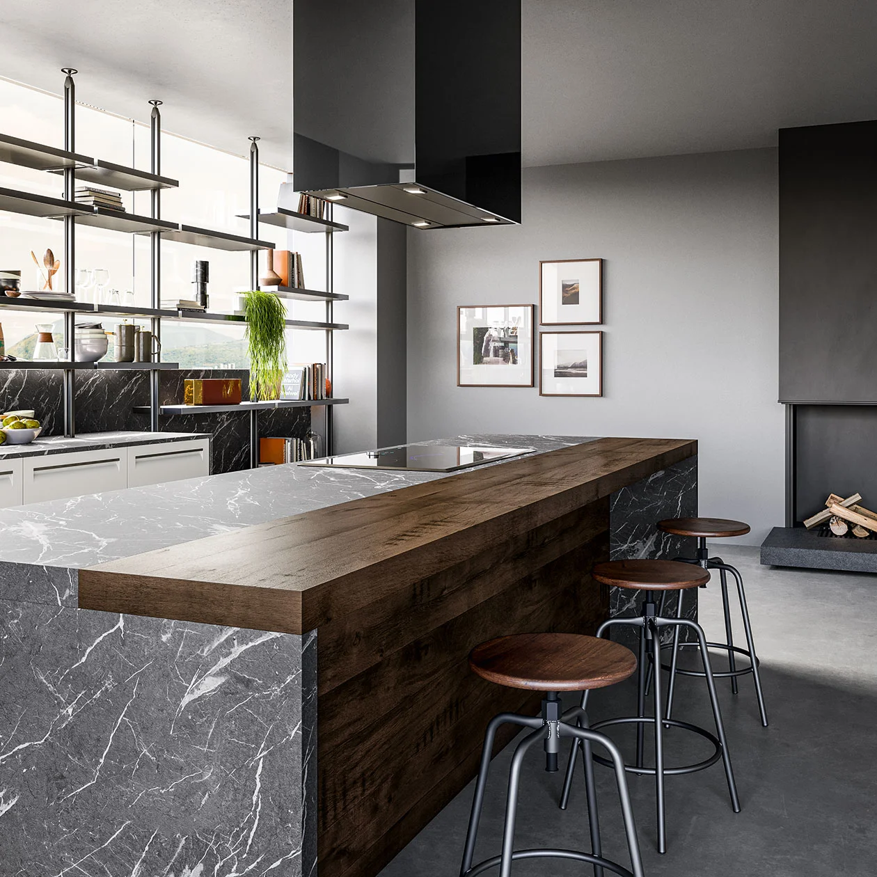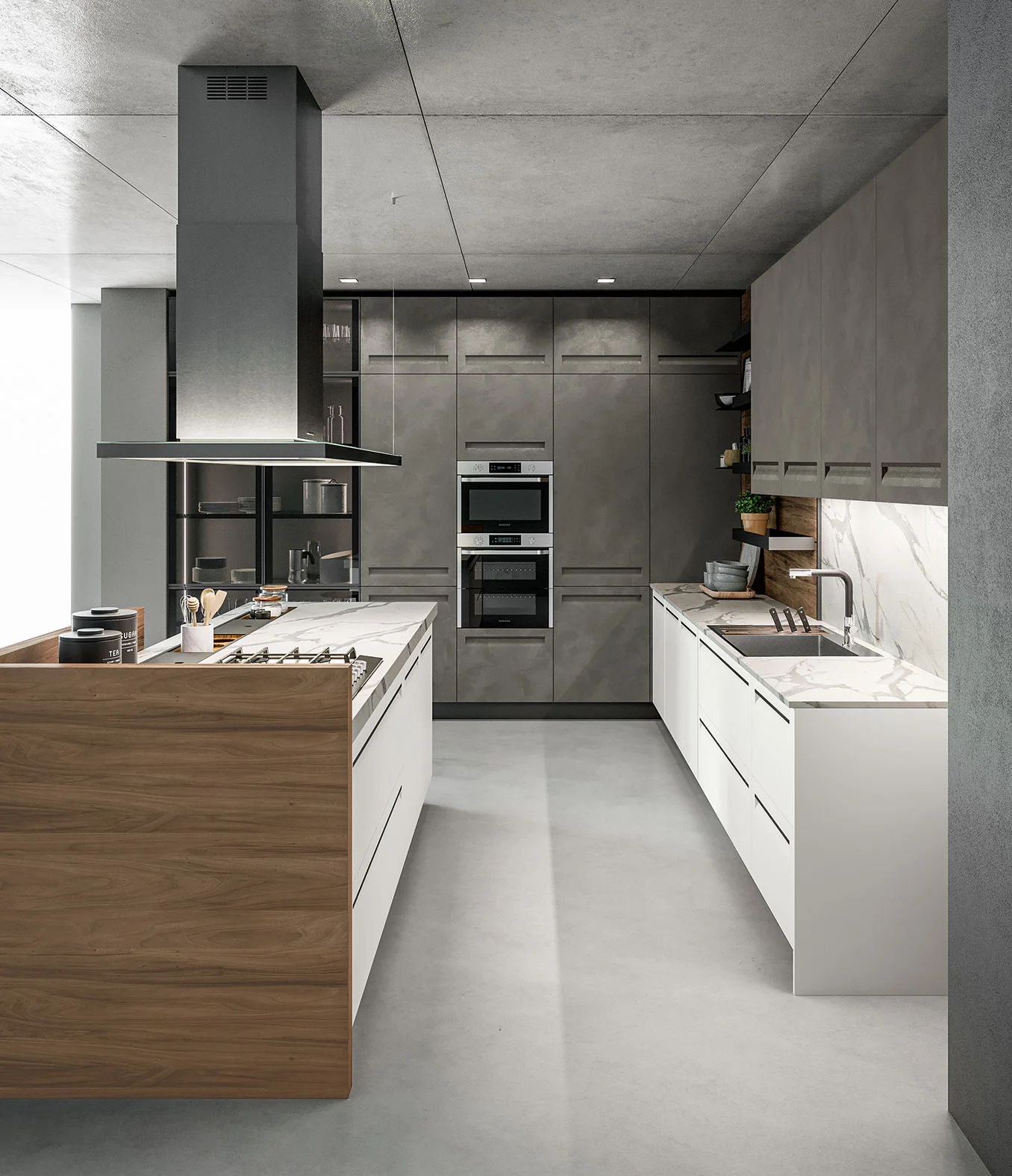 The materials used for Tekna are meant to last. They come in a mixture of PET in various resin-effect finishes, recycled PET that taps into the Gaia range ethos and has been applied to a panel of 100%-recycled particleboard or MDF, and modern laminates with a superb texture and top-quality feel: they mimic wood and stone, but are much simpler to use and easy to clean. They are also a straightforward match to the Flex System. It includes several different models, including Tekna, and gives you the freedom to mix and match characteristic pieces, thus creating a personalised composition. What emerges is the kitchen of your dreams. It stems from the Tekna model but grows in the direction of your desires.