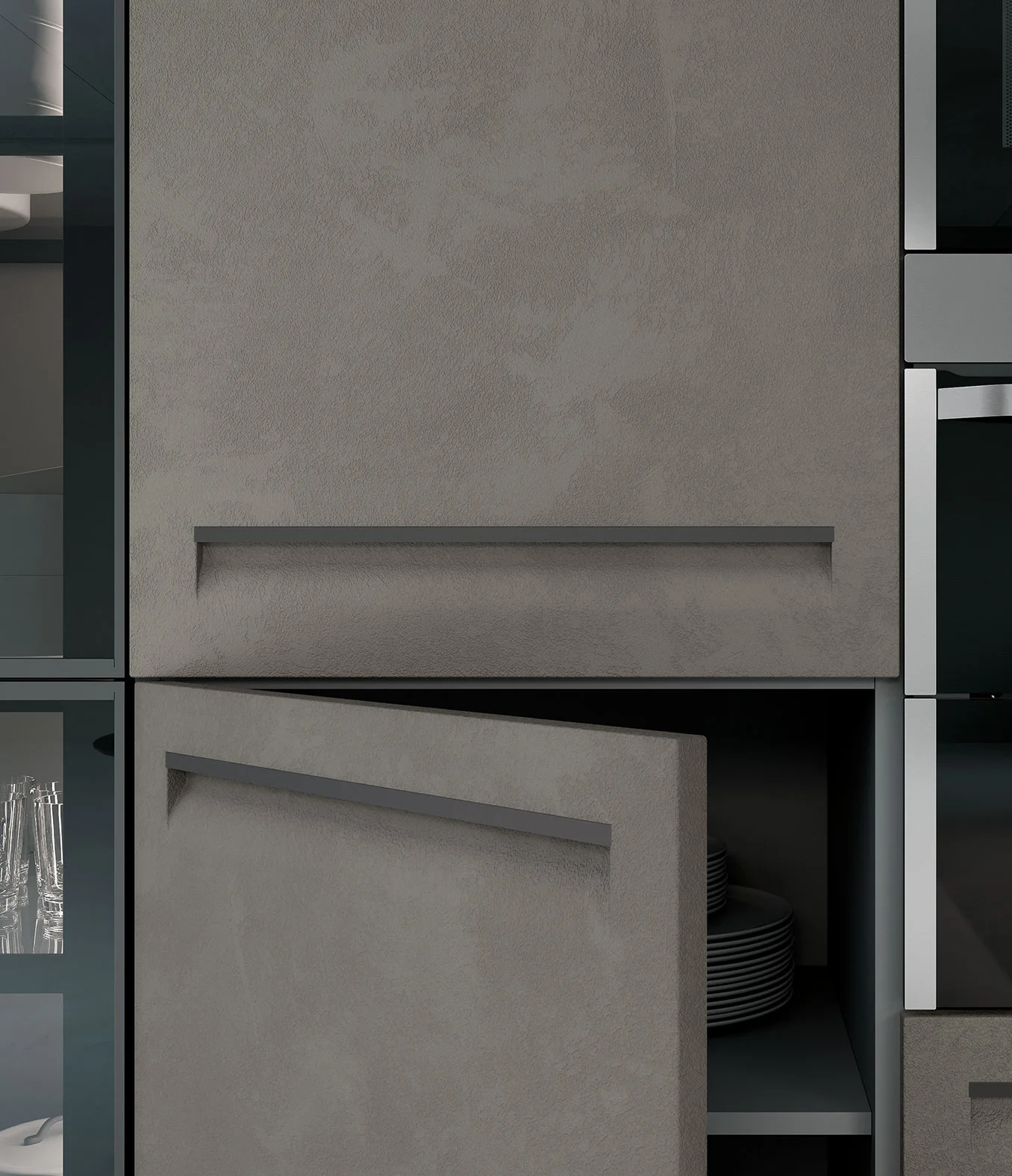 The handle built into the door of the Tekna kitchen evidences technical prowess and chimes with its modern linearity. The panel has been recessed and the groove is concealed by a metal strip. It makes for a smooth opening, an easy grip and a pristine aesthetic. One of those masterful little “technical tricks” that stems from experience and a love for the job. And this dedication to our craft transpires from the name “Tekna” itself, coming from the ancient Greek and meaning “the ability of crafting”. Perfect for appreciators of skill and curated details.