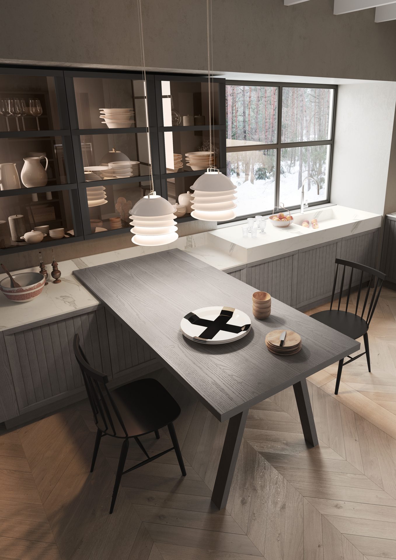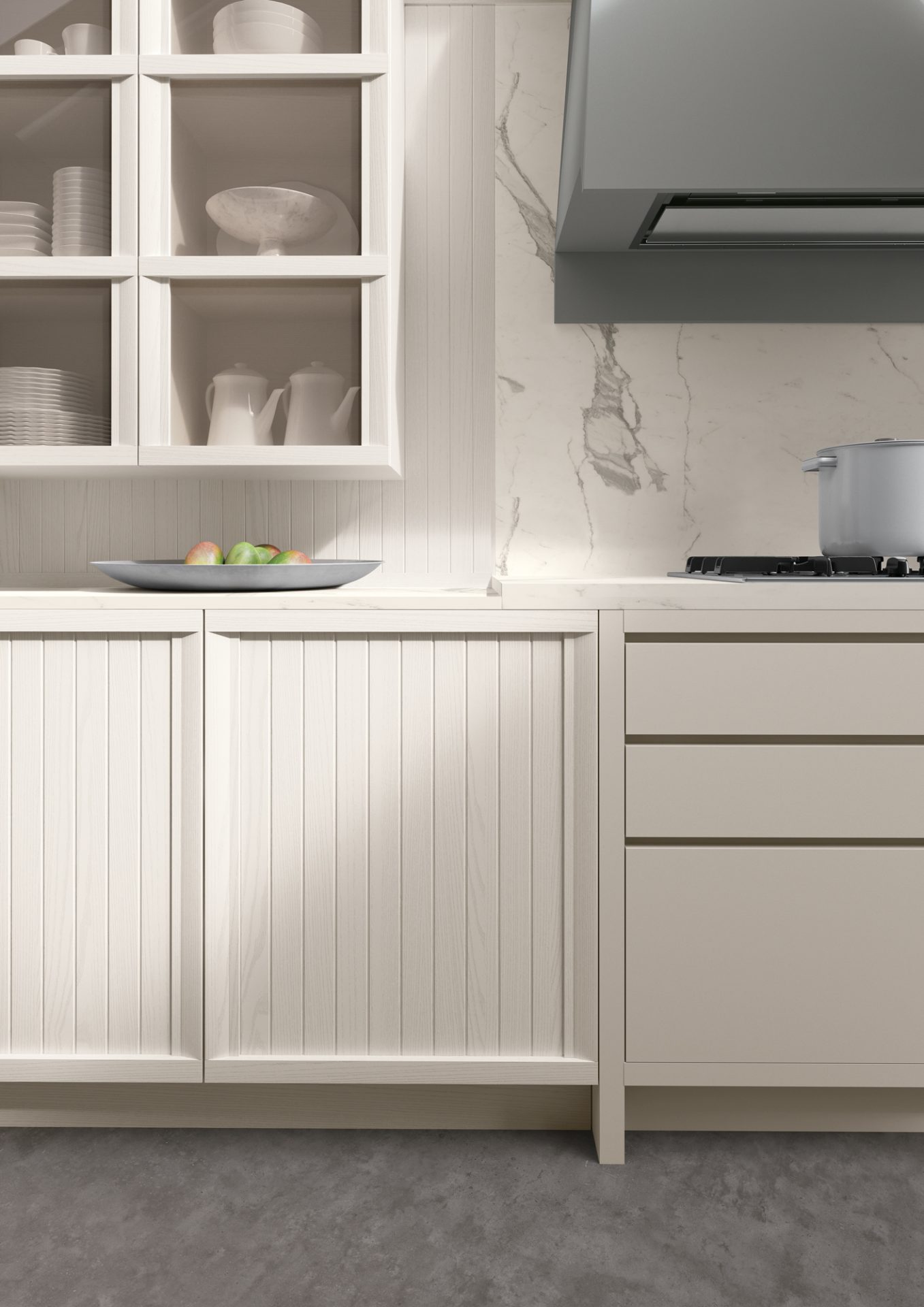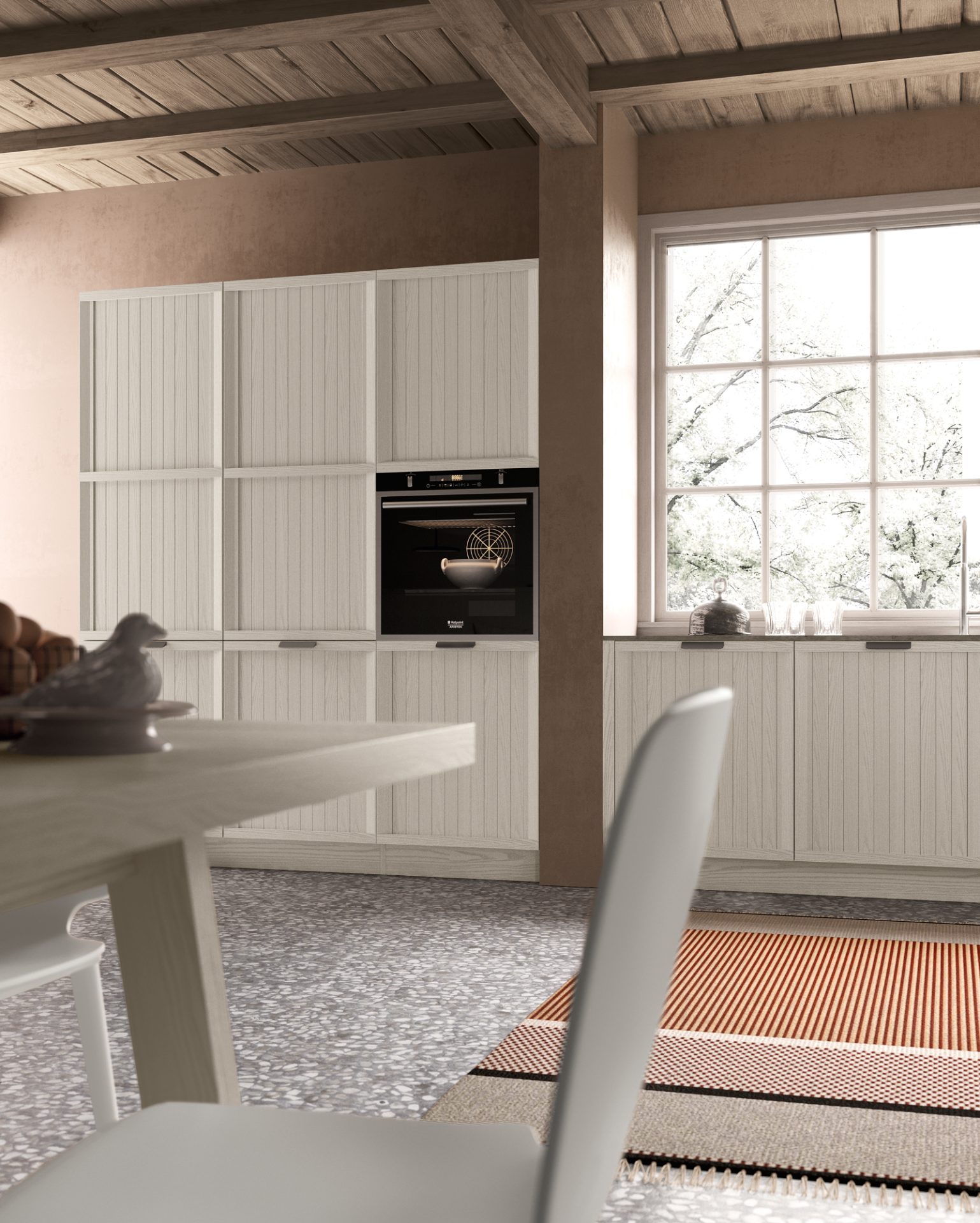 Horizontal and vertical lines merge to form perfectly balanced shapes, enhanced by surfaces characterised by slender vertical lines drawn on the door panels. An element that brings back the style of the past, harmoniously blended in an intentionally understated concept.