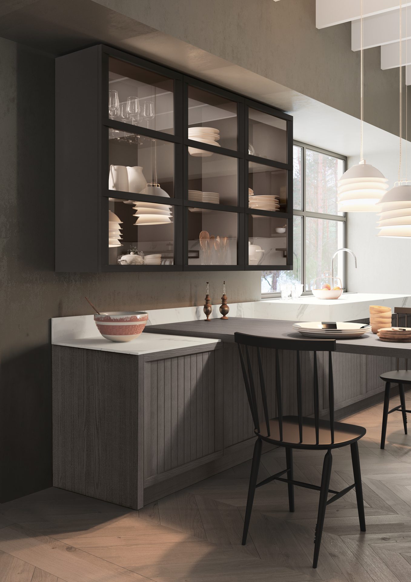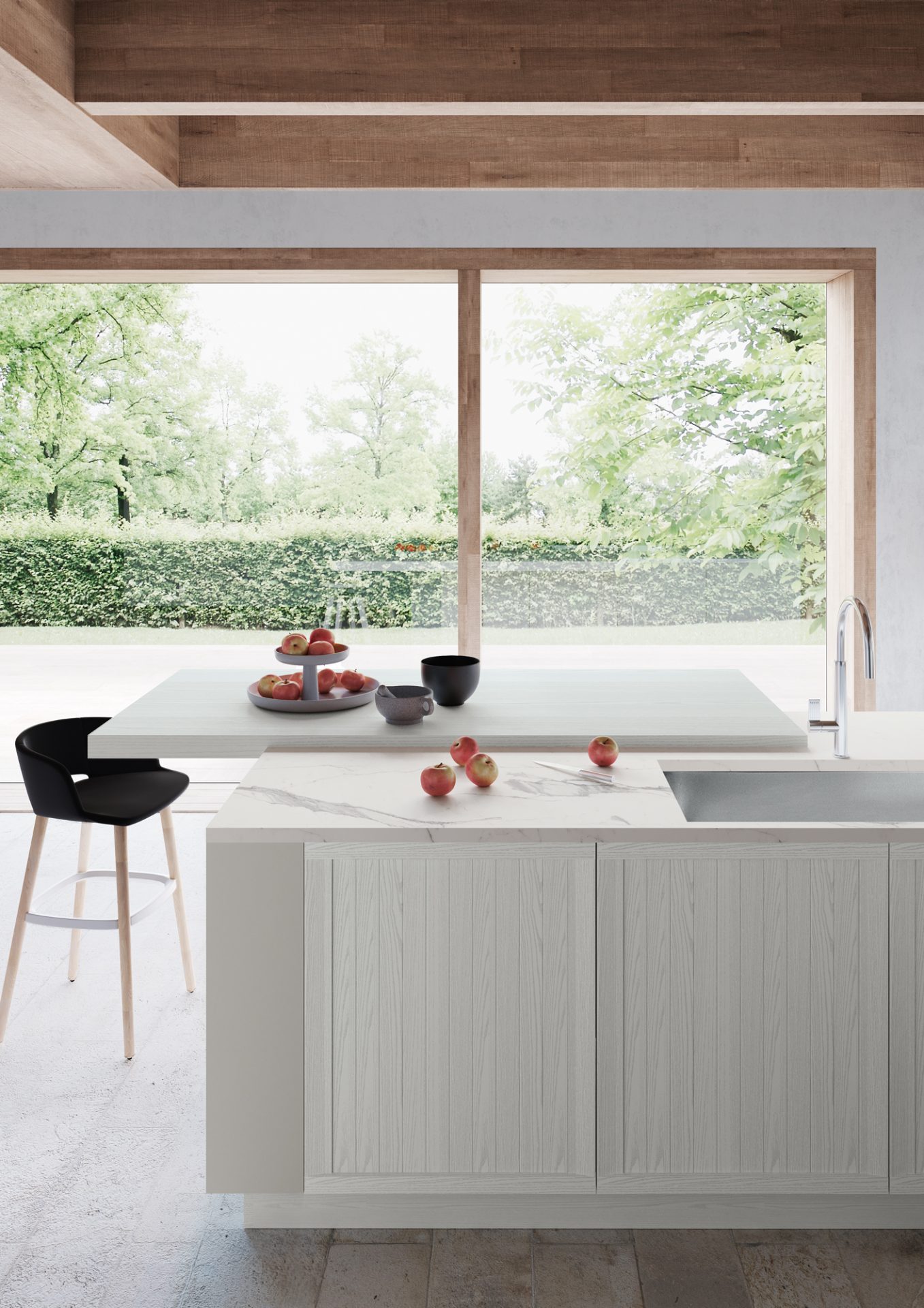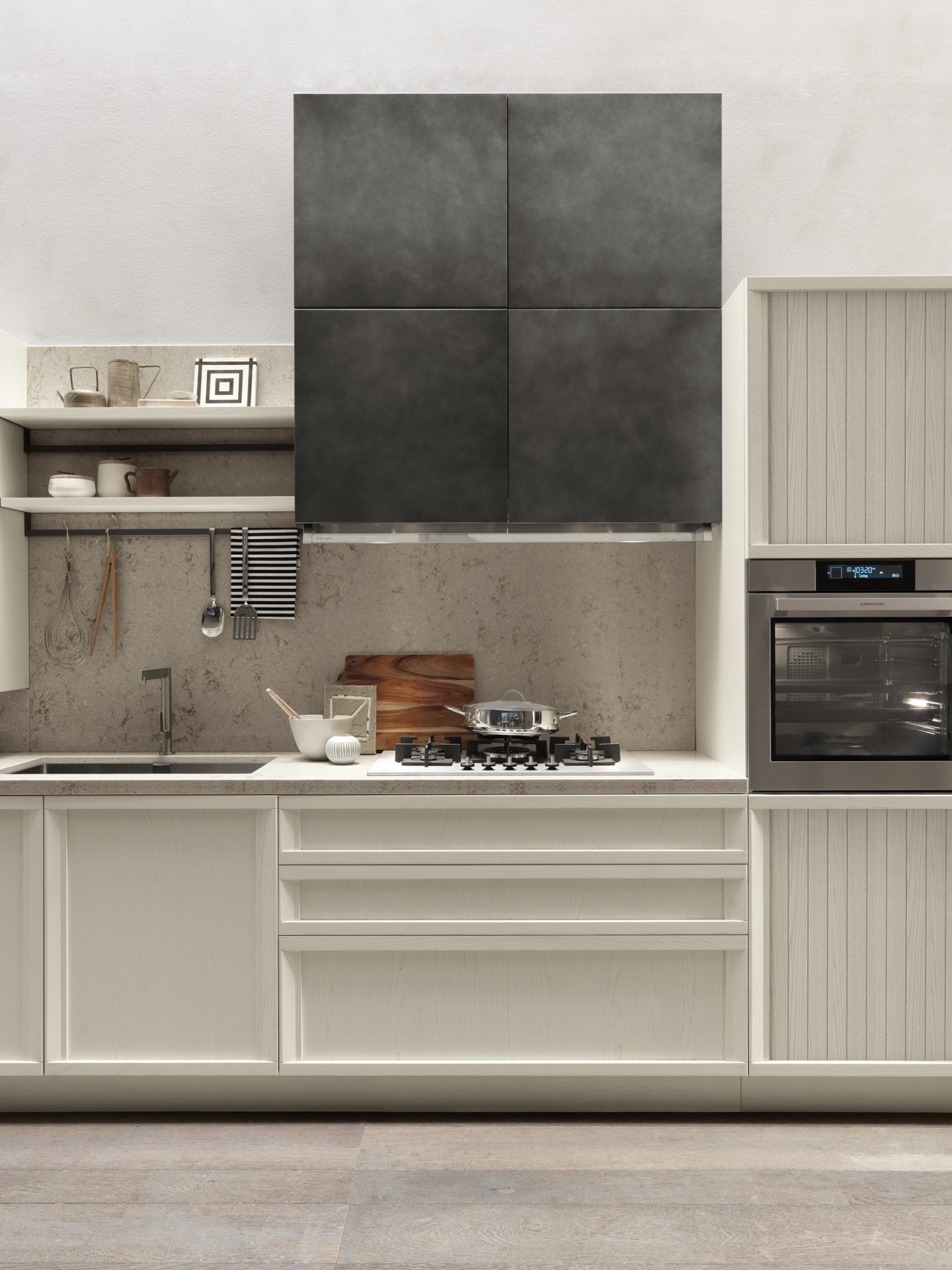 Horizontal and vertical lines merge to form perfectly balanced shapes, enhanced by surfaces characterised by slender vertical lines drawn on the door panels. An element that brings back the style of the past, harmoniously blended in an intentionally understated concept.