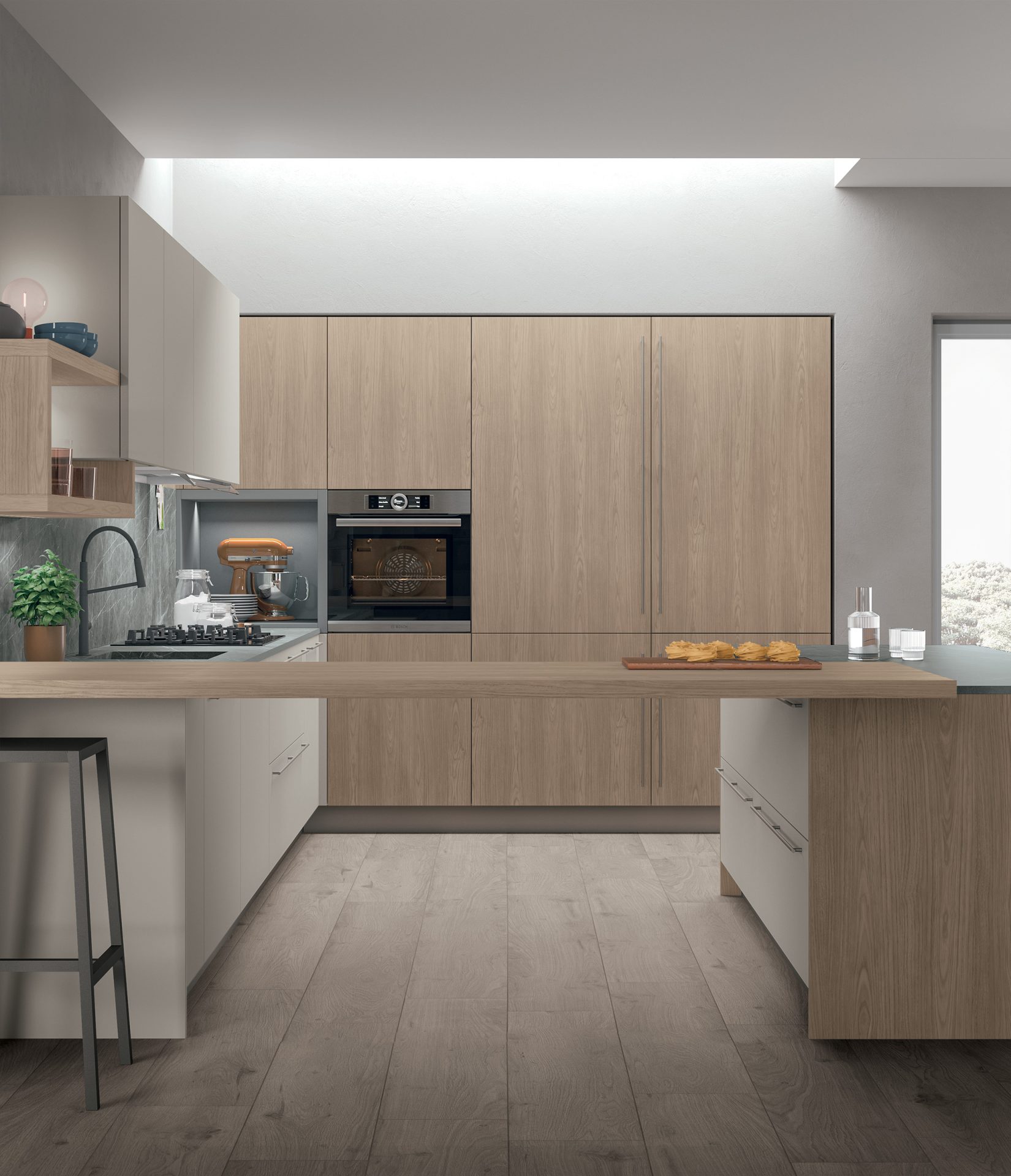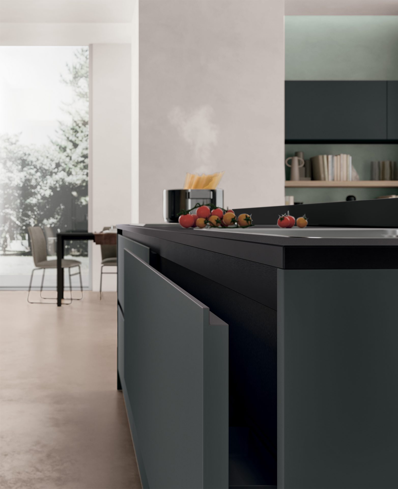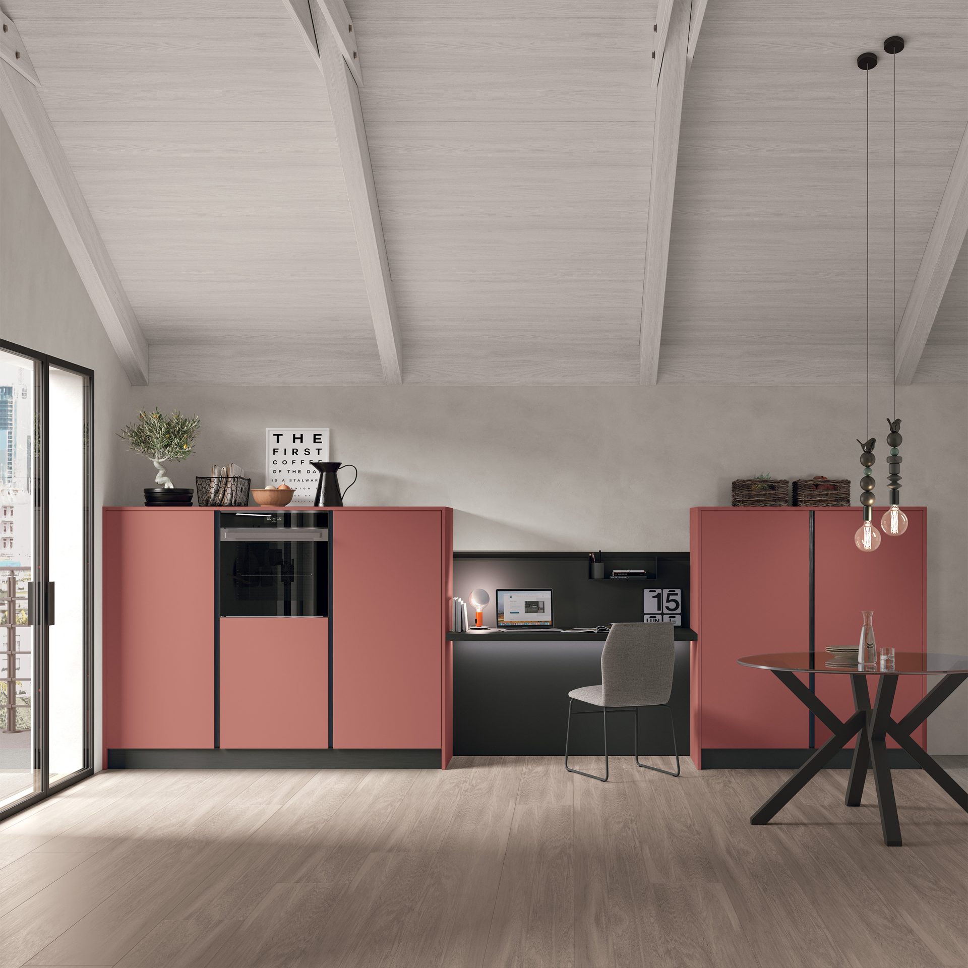 Young adapts to the new approach to study-work, and in the living space, lends a sense of shape to the home office corner. Different functionalities are created with a view to maintaining aesthetic unity within the open space. New finishes, new materials and textures and solid colours: with Young, you can create original combinations and pairings, expressing your personality in the kitchen.